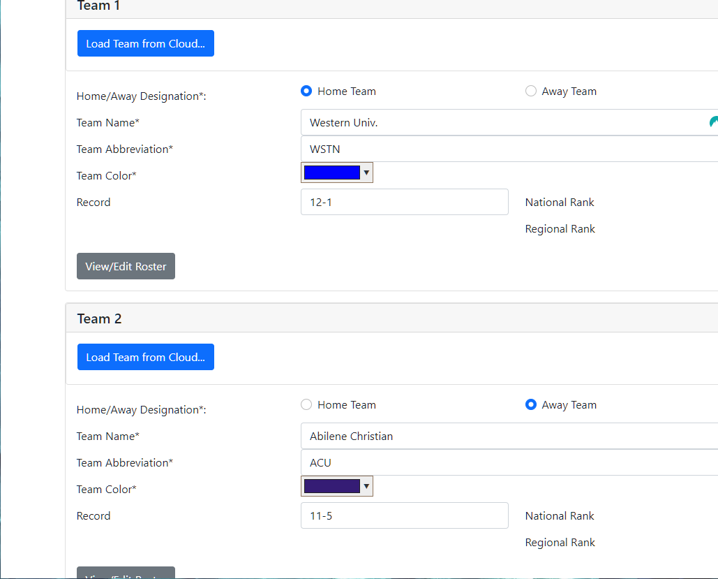 Home and visitor rosters and season stats can be loaded directly from the NCAA's database.